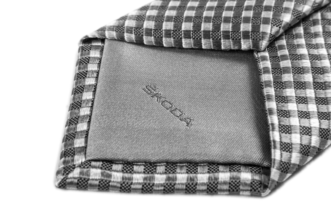 Úzká kravata v tónech šedé. Na rubu hedvábné kravaty je vyšité logo ŠKODA. Kravata se dodává v černé krabičce se stříbrným potiskem ŠKODA.