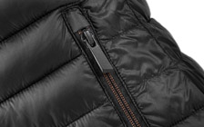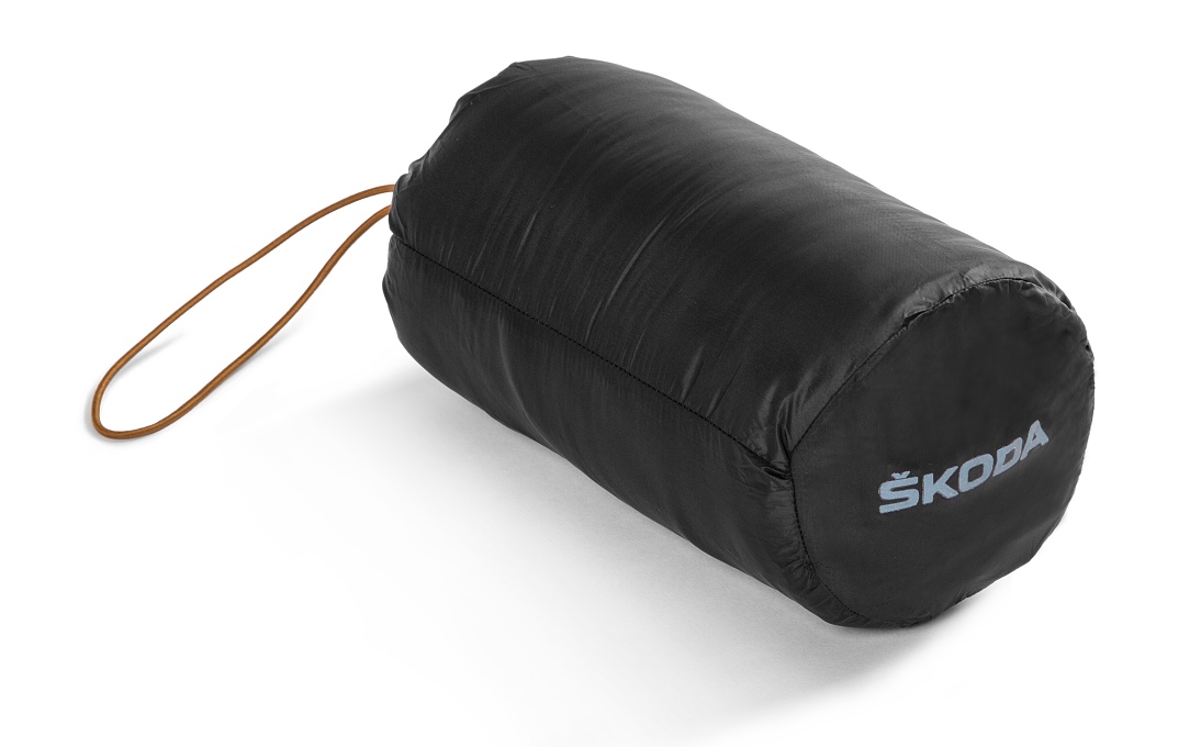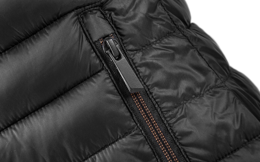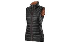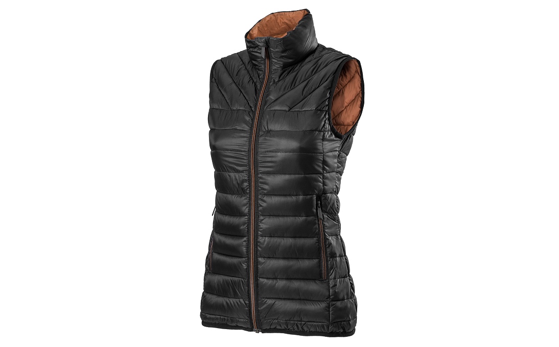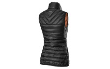 Ultralehká dámská zimní vesta ve sportovním designu, sbalitelná do příručního vaku. Černá vesta má kontrastně prošité zipy, vyšší límec s překrytím zipu u brady, průramky zakončené gumou a náprsní kapsu s vývodem pro sluchátka. Decentní branding ŠKODA na zadním díle.