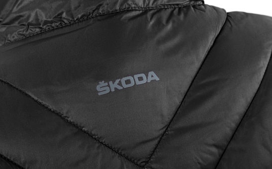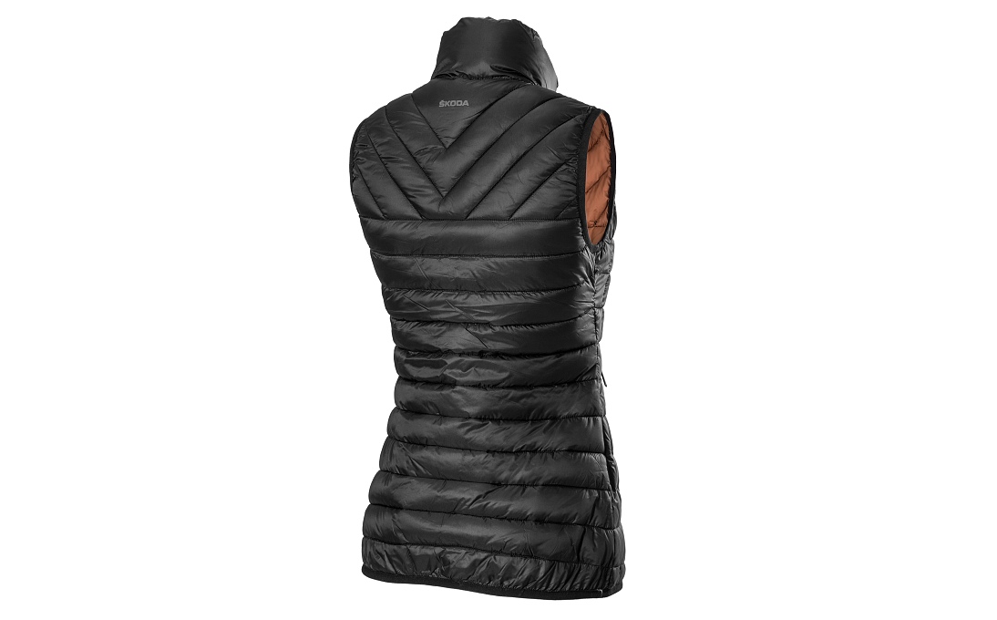 Ultralehká dámská zimní vesta ve sportovním designu, sbalitelná do příručního vaku. Černá vesta má kontrastně prošité zipy, vyšší límec s překrytím zipu u brady, průramky zakončené gumou a náprsní kapsu s vývodem pro sluchátka. Decentní branding ŠKODA na zadním díle.
