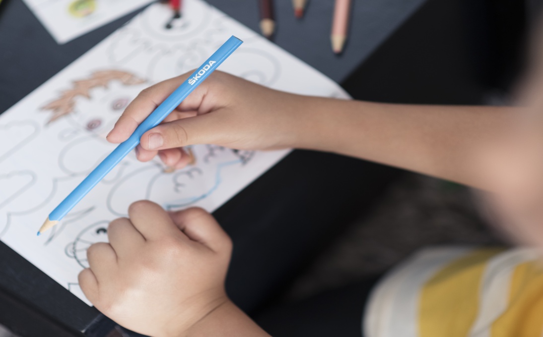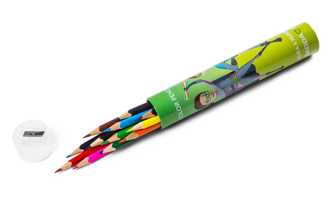 Set of 12 triangular coloring pencils in a metal tube with Laura and Klement's mascot print. The tube cap has an integrated pencil sharpener. Each pencil has a silver print ŠKODA.