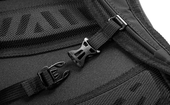 The back panel is equipped with comfortable EVA padding to increase comfort on longer rides. The backpack stays securely in place thanks to the chest and waist straps with buckles. A top handle for hanging adds to the practical details.
