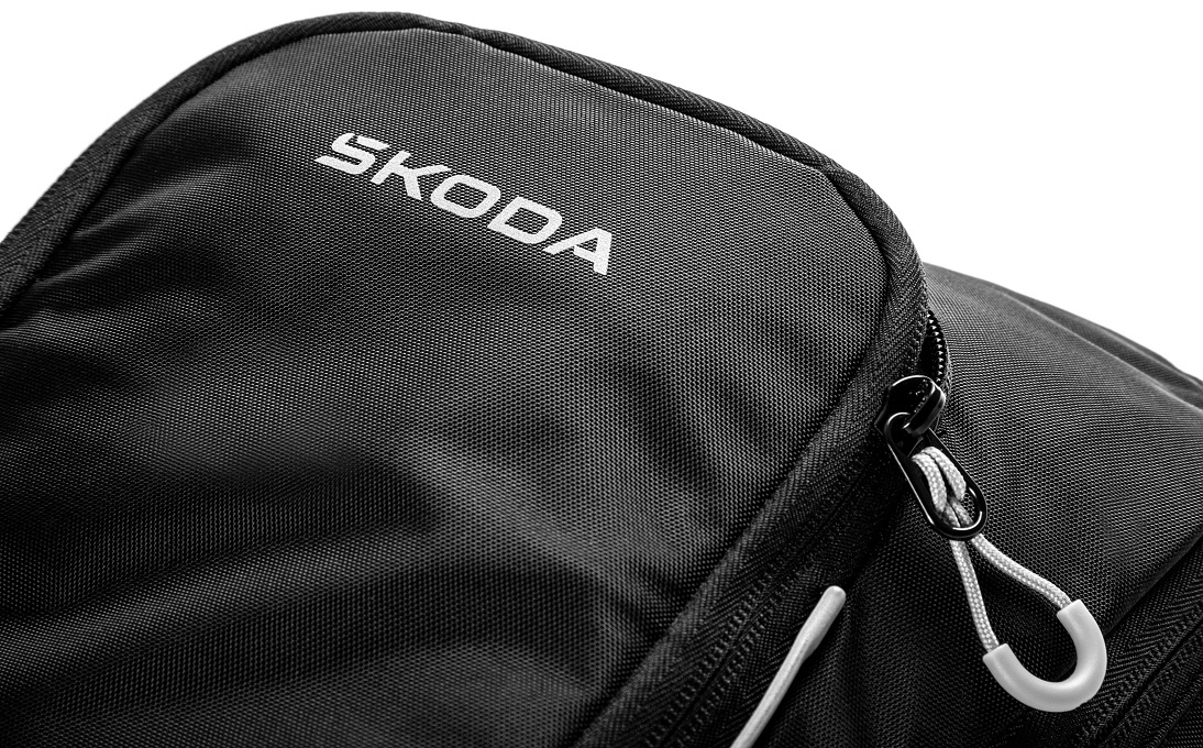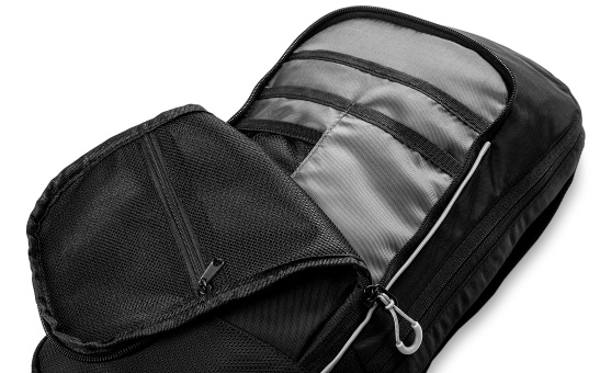 The small front zip pocket offers several practical compartments for your essentials. The spacious rear compartment is designed to hold a hydration bladder – the tube with mouthpiece can be easily routed through a dedicated opening and along the strap.