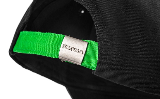 Black baseball cap Motorsport with green peak, cut with 6 panels, green belt for regulation of the size with a metal buckle with embossed logo ŠKODA. Branding: R5 print on the two front panels, white ŠKODA Motorsport on the side.