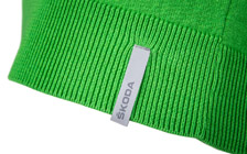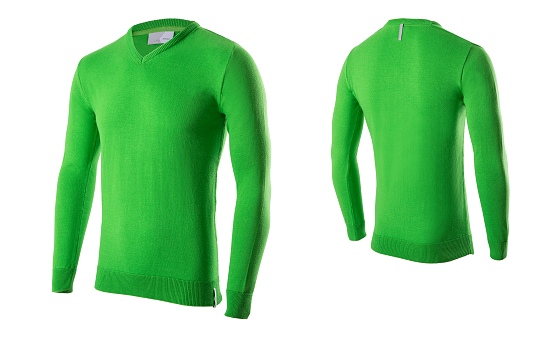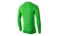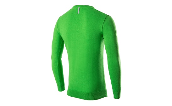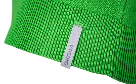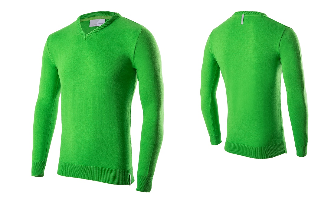 Fitted men's pullover in ŠKODA green with sportive V-Neck. The ŠKODA logo label is positioned on the front along the body hem. A silver reflective hanger loop is applied on the backside underneath the neck line.