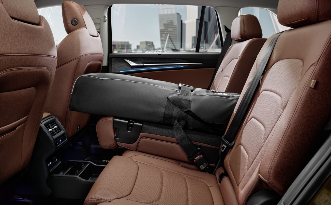 Create the necessary space by folding down the armrest of the middle rear seat to the bottom position and, if applicable, the third row of seats. Push the skis and holes inside the sack (tips backwards) and close the zip. Then place the sack into the gap you´ve created - the zipped end is lying in the boot. Tighten the tie strap around the skis in front of the binding - the strap needs to hold the skis tight. Insert the strap latch into the middle-seat lock. Attach the snap-hooks to the fixing eyelets. For better access to the eyelets, fold down the backrests of the second row of seats. Tighten the strap properly to ensure that the sack stays in place even in abrupt direction changes.